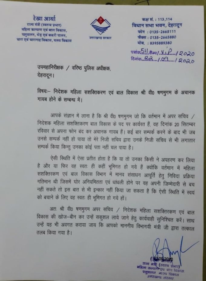 एसएसपी देहरादून को लिखे पत्र में मंत्री रेखा आर्य ने लिखा है -आपके संज्ञान में लाना है कि वी. षणमुगम जो कि वर्तमान में अपर सचिव / निदेशक महिला सशक्तिकरण बाल विकास के पद पर कार्यरत हैं , वह दिनांक 20 सितम्बर रविवार से अपना फोन बंद कर अचानक गायब हैं। कई बार सम्पर्क करने के बाद भी जब उनसे सम्पर्क नहीं हो पाया तो मेरे निजी सचिव द्वारा उनके निजी सचिव से भी लगातार सम्पर्क किया किन्तु उनका कोई पता नहीं चल पाया है।
