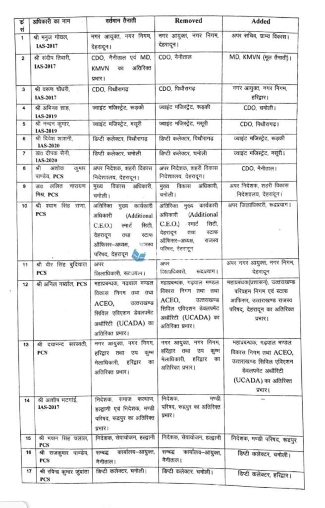 इनके अलावा पीसीएस अधिकारी दयानंद सरस्वती से हरिद्वार नगर आयुक्त की जिम्मेदारी वापस ले ले गई है। उन्हें गढ़वाल मंडल विकास निगम का महाप्रबंधक बनाया गया है। पीसीएस अधिकारी ललित नारायण मिश्रा से मुख्य विकास अधिकारी चमोली की जिम्मेदारी वापस ली गई है। उन्हें शहरी विकास विभाग में निदेशक बनाया गया है।