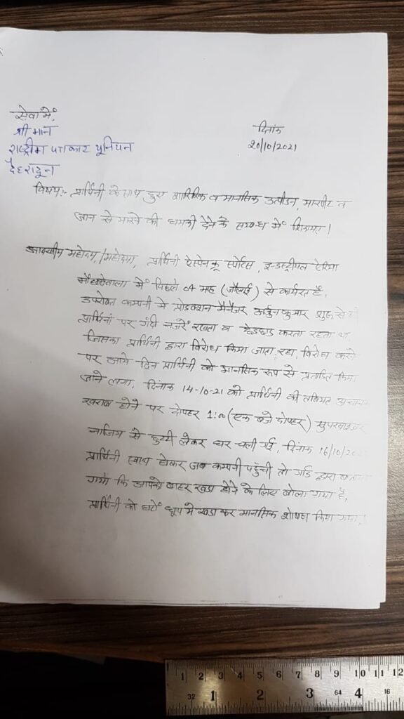 देहरादून। मोहब्बेवाला इंडस्ट्रियल इस्टेट स्थित एक कंपनी के कर्मचारी द्वारा कंपनी के ही प्रोडक्शन मैनेजर के विरुद्ध कई गंभीर आरोप लगाते हुए निर्भया प्रकोष्ठ व थाना पटेल नगर में शिकायती पत्र देते हुए कार्रवाई की मांग की गई है जानकारी के अनुसार मोहब्बेवाला इंडस्ट्रियल एरिया में स्थित s10pro स्पोर्ट्स कंपनी के प्रोडक्शन मैनेजर अर्जुन कुमार पर यही कि कर्मचारी द्वारा यौन शोषण जैसा गंभीर आरोप लगाया गया है।