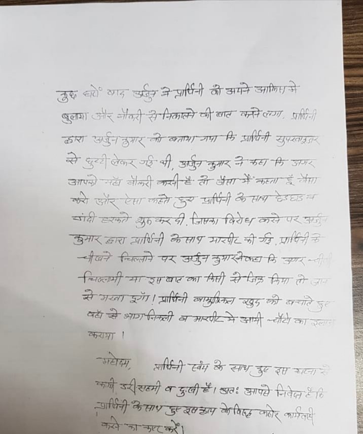 दिनांक 14 अक्टूबर को फैक्ट्री में ही युवती की तबीयत अचानक खराब होने पर दोपहर सुपरवाइजर नाजिम से छुट्टी लेकर घर चली आई स्वस्थ होने पर जब युवती 16 तारीख को फैक्ट्री पहुंची तो उसको घंटों धूप में खड़ा कर मानसिक शोषण किया गया कुछ घंटों बाद अर्जुन ने युवती को अपने ऑफिस में बुलाया और युवती के साथ छेड़छाड़ शुरू कर दी युवती ने इसका विरोध किया तो अर्जुन द्वारा युवती के साथ मारपीट की गई युवती के चीखने चिल्लाने पर युवती को जान से मारने की धमकी भी दी गई।