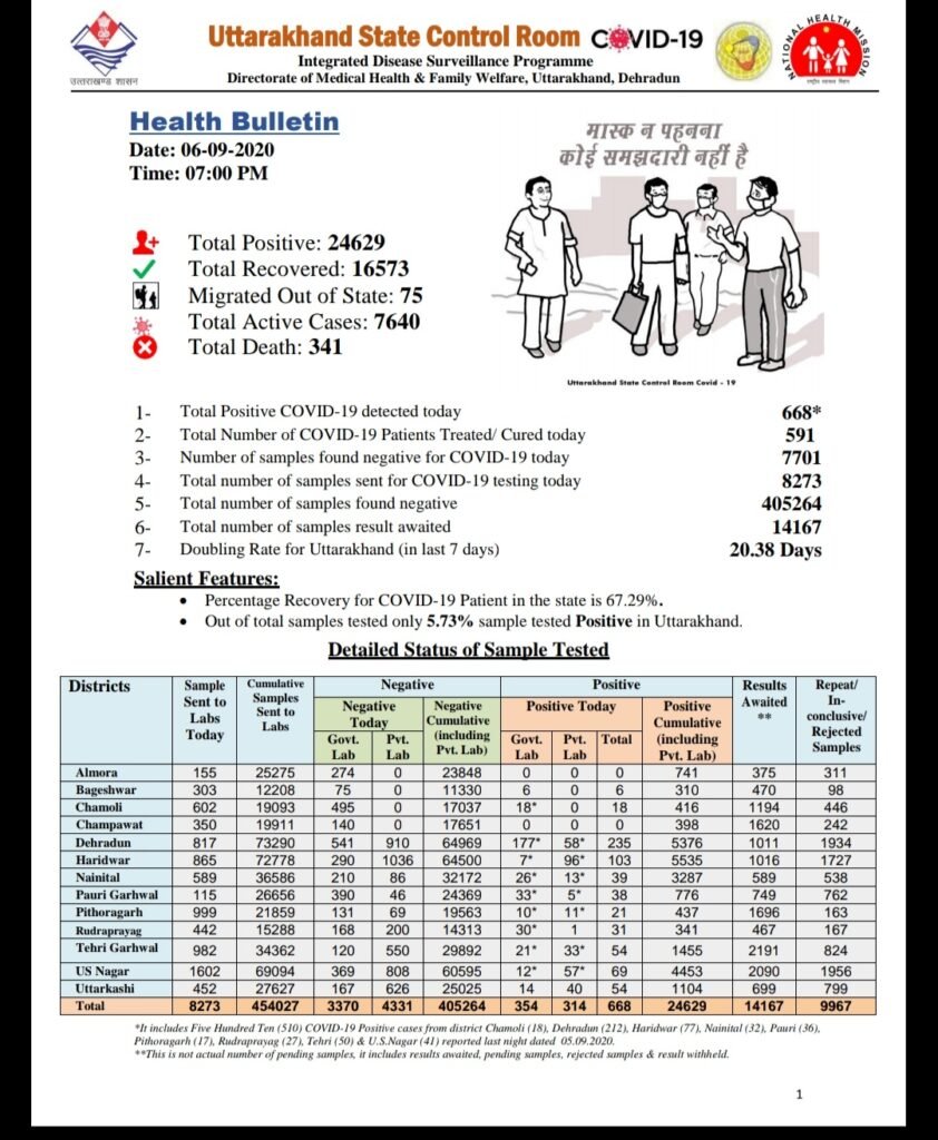 उत्तराखंड मे स्वास्थ्य विभाग से जारी हेल्थ रिपोर्ट के अनुसार कोरोना मरीजो की संख्या हुई 24629 आज कुल 668 नए मामले मिले , वही 16573 मरीज हुए है ठीक जब कि इस कोरोना संक्रमण से 341 लोगो की मौत भी हुई है ।