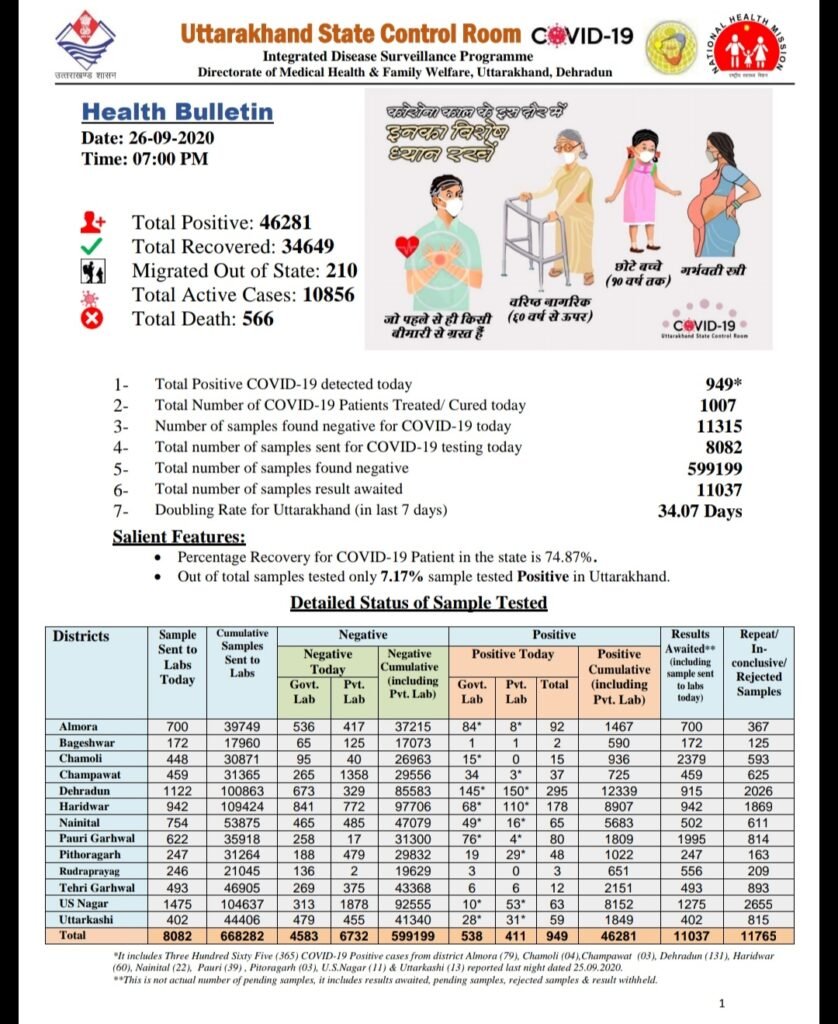 प्रदेश के आज के मेडिकल बुलेटिन के अनुसार आज अल्मोड़ा जिले में 92, देहरादून में 295, हरिद्वार में 178, नैनीताल में 65, पौड़ी में 80, पिथौरागढ़ में 48, यूएस नगर में 63 व उत्तरकाशी में 59 मामले आए, जबकि देहरादून के 389, हरिद्वार के 204, नैनीताल के 62, पौड़ी के 31, पिथौरागढ़ के 37, यूएस नगर के 165 व उत्तरकाशी के 47 लोग स्वस्थ हुए।