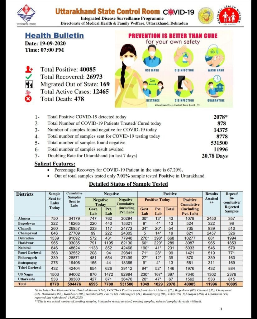 उत्तराखंड में कोरोना बेकाबू होता दिख रहा है। आज प्रदेश में कोरोना के रिकॉर्ड 2078 नए केस मिले हैं। इसके साथ ही प्रदेश में कुल मामलों की संख्या तेजी से 40 हजार का आंकड़ा पार करते हुए 40085 तक पहुँच गया है।