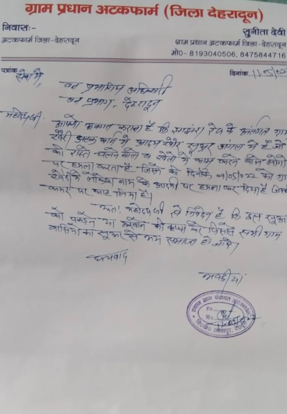 इस संबंध में वन विभाग के डीएफओ नितेश त्रिपाठी जी से फोन पर वार्ता की गई उनको सारा घटनाक्रम बताया गया उनके द्वारा बताए गए कि उनको इस बारे में जानकारी नहीं थी और नहीं इस तरह का कोई पत्र प्राप्त नही हुआ है लेकिन आपके द्वारा जो सूचना दी गई है उस पर तुरंत कार्रवाई करवाएंगे और जो भी संभव हो सकेगा हम ग्रामीणों की मदद करेंगे और हम भी कोशिश करते हैं कि वन्य जीवों से किसी भी ग्रामीण को कोई हानि ना हो।