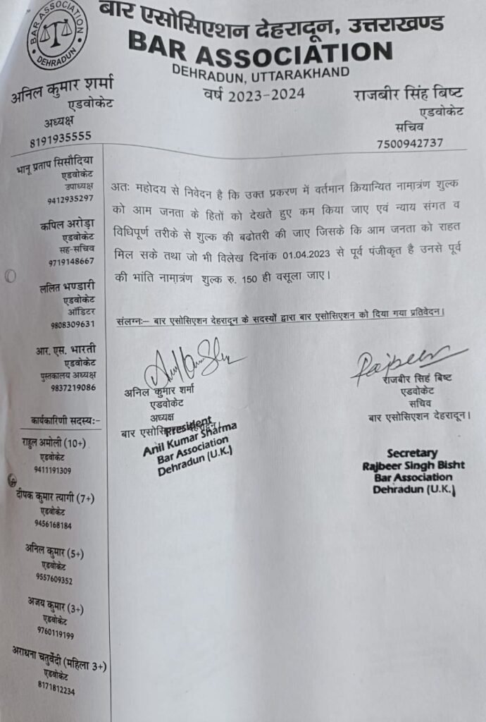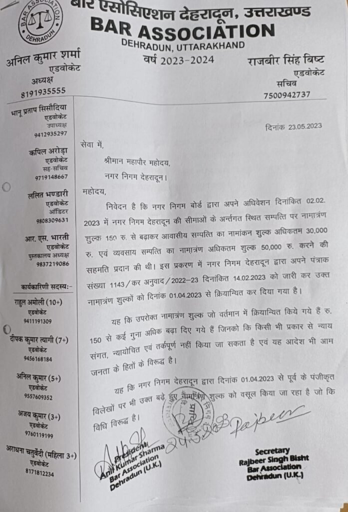 बार एसोसिएशन देहरादून के अध्यक्ष अनिल कुमार शर्मा और महासचिव राजवीर सिंह बिष्ट के नेतृत्व में अधिवक्ताओं का शिष्टमंडल राजधानी के मेयर सुनील उनियाल गामा से मिला। शिष्टमंडल ने मेयर को सौंपे ज्ञापन में कहा कि साल 1994 से दाखिल खारिज के लिए मात्र 150 रुपये का शुल्क लिया जा रहा था, जिसे नगर निगम ने बोर्ड बैठक में कई गुना बढ़ा दिया।