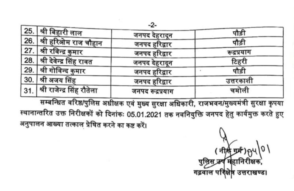 देहरादून के बाद इंस्पेक्टर (inspector) बने 31 लोगों को नई तैनाती दे दी गई है। डीआईजी गढ़वाल नीरू गर्ग (dig garhwal neeru garg) ने सोमवार को इसके आदेश जारी किए। पदोन्नति के बाद इन्हें विभिन्न जनपदों में तैनाती मिली है।