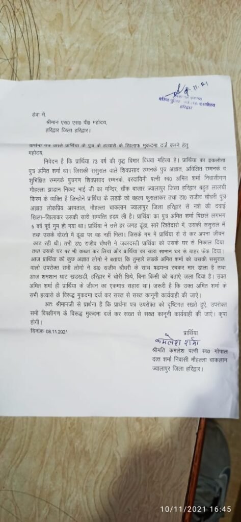 हरिद्वार। हमें इंसाफ चाहिए हमारे भाई के हत्यारो तुम्हें भगवान कभी माफ नहीं करेगा । हमारी मां का मकान, सोना, बैंक बैलेंस सब कुछ हड़पकर मेरी मां को सड़क पर मरने के लिए छोडने वाले और मेरे भाई को भगाने वाले सुविक्षित रमन अविक्षित रमन,शिवप्रसाद रमन (भाई जी के मंदिर, चौक बाजार वाले) और लोकप्रिय हॉस्पिटल के स्वामी डॉक्टर राजीव चौधरी ने संदिग्ध परिस्थितियों में बिना हमारे परिवार को जानकारी दिए उसकी लाश को क्यो जलाया।