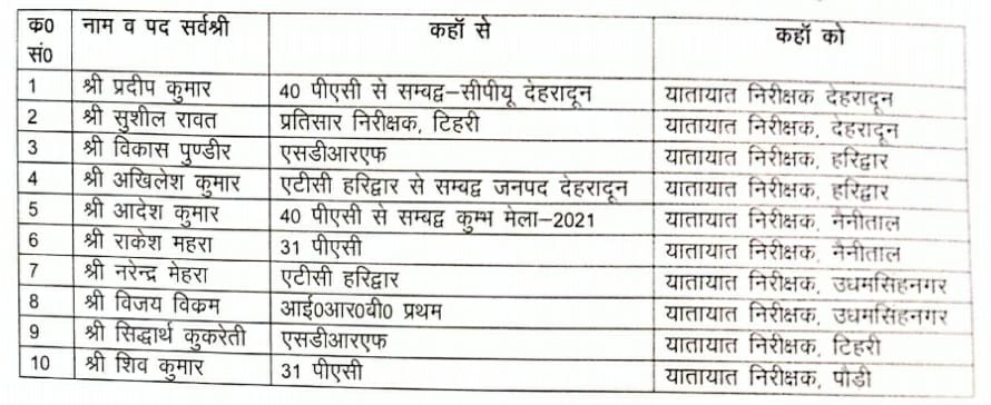 निम्नाकिंत प्रतिसार निरीक्षकों/दलनायकों को यातायात निरीक्षक के पद पर स्थानांतरित किया गया है।