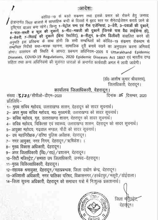 देहरादून । डीएम डाॅ आशीष कुमार श्रीवास्तव नेे जनपद के विभिन्न तहसील क्षेत्रान्तर्गत निर्धारित साप्ताहिक बन्दी के सम्बन्ध में कहा है कि ऐसे वैवाहिक समारोह जो पूर्व में निर्धारित किए गए हैं तथा जिसको सम्पादित करने के लिए पूर्व अनुमति ली गई है ऐसे वैवाहिक समारोह के आयोजन में साप्ताहिक बन्दी के अन्तर्गत छूट होगी। इसके अतिरिक्त होम डिलिविरी के माध्यम से क्रय-विक्रय की जाने वाली सामग्री-सामान के सम्बन्ध में भी साप्ताहिक बन्दी के अन्तर्गत छूट रहेगी।