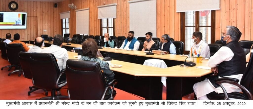 देहरादून । मुख्यमंत्री त्रिवेन्द्र सिंह रावत ने प्रधानमंत्री नरेन्द्र मोदी के मन की बात कार्यक्रम को सुना। मुख्यमंत्री ने कहा कि हमें प्रधानमंत्री नरेन्द्र मोदी जी की अपील के अनुसार त्योहारों के समय कोरोना का ध्यान रखते हुुुए मर्यादा का पालन करना है। प्रधानमंत्री जी ने त्योहारों में कोरोना काल में पूरे मनोयोग से लगे कोरोना योद्धाओं एवं सफाई नायकों को खुशियों पर्वों को मनाने के लिए अपने साथ शामिल करने की अपील की है।