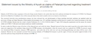 मंत्रालय का मानना है कि अभी तक पतंजलि द्वारा किया जा रहा दावा पर कोई जांच नहीं किया है। मंत्रालय ने कहा है कि आयुर्वेदिक दवा प्रोभिजन ऑफ़ ड्रग एण्ड मैजिक रेमेडिज एक्ट-1954 के अंतर्गत आता है। इसके तहत कंपनी को दवा बाजार में उतारने या प्रमोशन से पूर्व मंत्रालय को अपने दावा का साक्ष्य और बनाने की विधि और उसके कंपोजिशन की जानकारी देनी होगी।